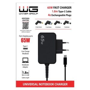 WG – Univerzální nabíječka 65W pro notebook s Type-C konektorem, + 4 adaptéry, kabel 1,8 metrů