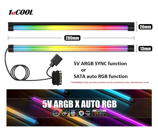 1stCOOL AURA RAINBOW led ARGB osvětlení, skleněná trubice 28cm 3-pin ARGB konektor, nebo automatický režim přes SATA konektor