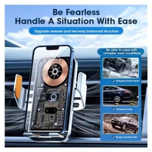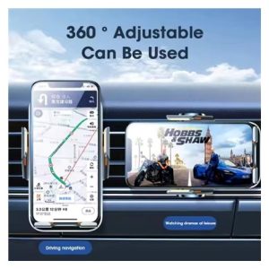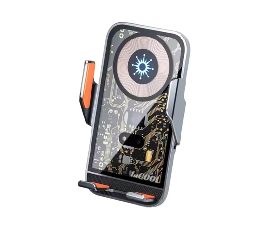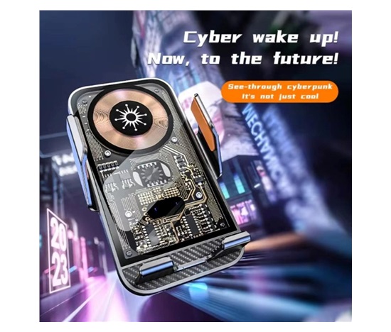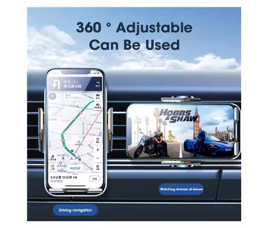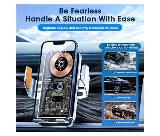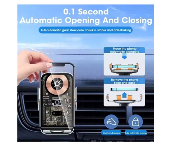C10 Kvalitní hliníková bezdrátová inteligentní nabíječka do auta s optickým senzorem pro automatické rozevření při vkládání telefonu a dotykovým senzorem pro otevření držáku při vyjmutí. Vybavená je držákem s kloubovou aretací pro uchycení do ventilace.