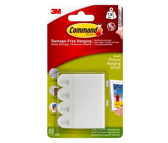 Jedna sada 4 proužků ve velikosti S udrží zátěž až 1,8 kg. Proužky 3M Command Picture Hanging Strips jsou vhodné nejen pro zavěšení obrazů, ale i dřevěných písmen, desek z akustické pěny, zrcadel, nástěnných hodin, tabulí pro suché mazání a mnoho dalšího.