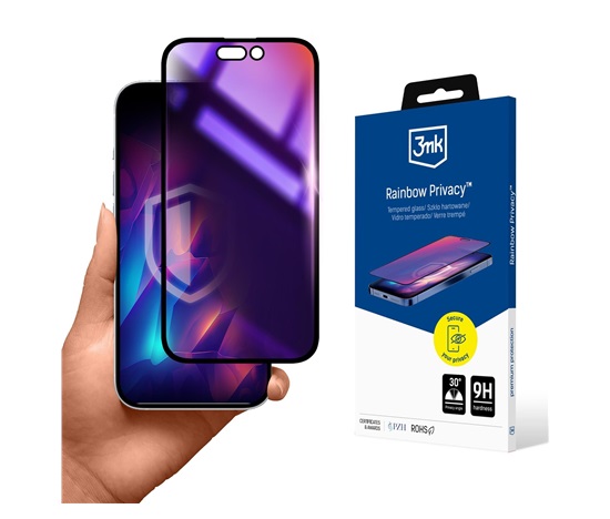 V dnešní době je soukromí nesmírně důležité. Technologie 3mk Rainbow Privacy™ se postará o vaše bezpečí. Díky inovativnímu řešení je obsah obrazovky viditelný pouze pro osobu, která se na ni přímo dívá, což snižuje riziko zneužití ze strany třetích osob. Vaše soukromé zprávy, bankovní údaje nebo fotografie zůstanou jen vaše, a to i na veřejných místech.