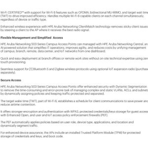 Aruba Secure Infrastructure The Aruba 503 Series supports a Zero Trust/Secure Access Service Edge (SASE) architecture to better protect user authentication and wireless traffic. Select capabilities include: