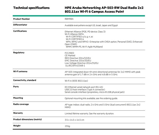 5x HPE Aruba Networking AP-503-RW Dual Radio 2×2:2 802.11ax Wi-Fi 6 Campus Access Point ( 5x R8M98A )