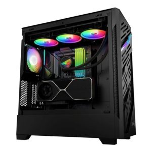 Provedení skříně:Desktop; Barva skříně:Černá; Počet pozic 3.5″ (HDD):2; Počet pozic 2.5″ (SSD):2; Bočnice:Prosklená; Podsvícení:ARGB; Vybavení PC skříně:Přední Audio panel, Přední USB panel, Průhledná bočnice