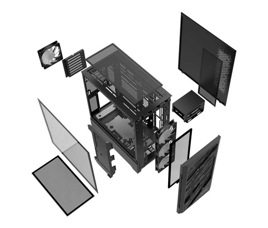 Provedení skříně:Desktop; Barva skříně:Černá; Počet pozic 3.5″ (HDD):2; Počet pozic 2.5″ (SSD):2; Bočnice:Prosklená; Podsvícení:ARGB; Vybavení PC skříně:Přední Audio panel, Přední USB panel, Průhledná bočnice