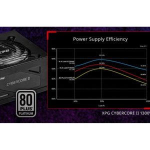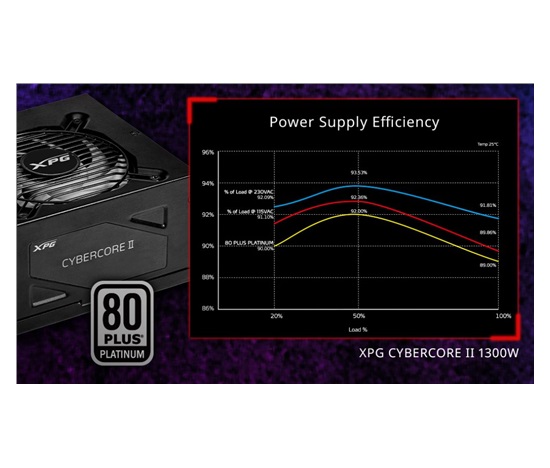 Účinnost XPG CYBERCORE II dosahuje 92,91 % 150 VAC při 50% zatížení (při teplotě 25 °C) a zajišťuje příkladný výkon i podle standardů 80 PLUS PLATINUM.