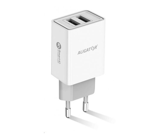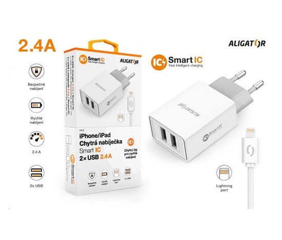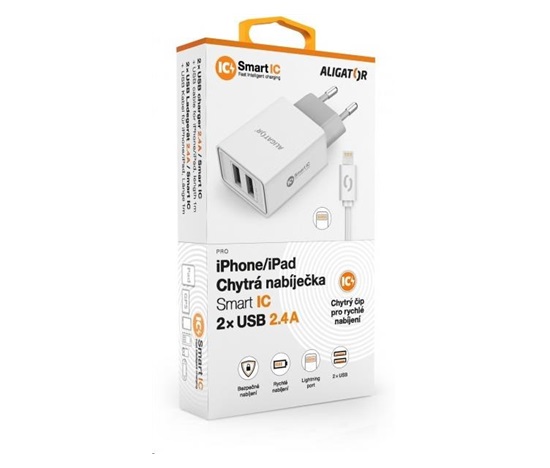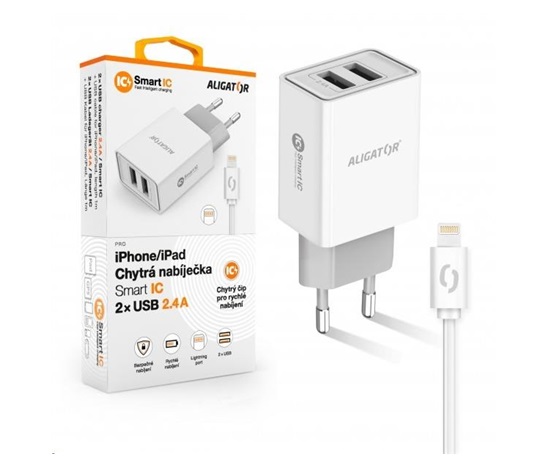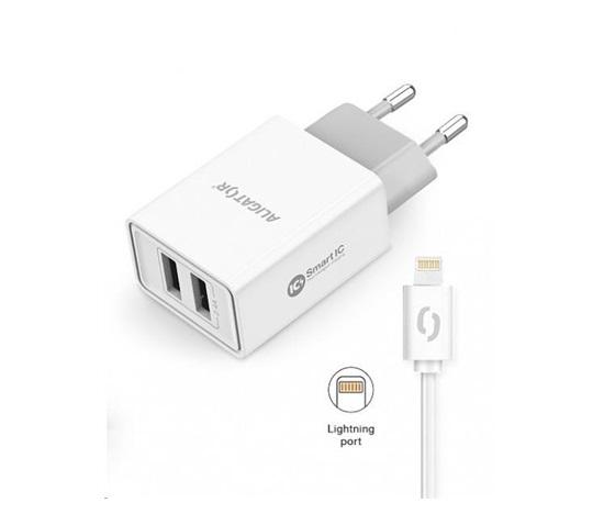 Chytrá síťová nabíječka ALIGATOR 2.4A, 2xUSB, smart IC, bílá, kabel pro iPhone/iPad 2A