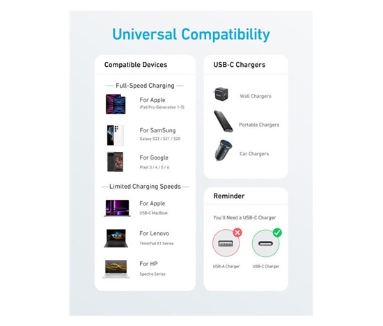 Spolehlivé nabíjení: Kompatibilní s USB-IF pro bezpečné a spolehlivé nabíjení s prakticky jakýmkoli zařízením USB-C.