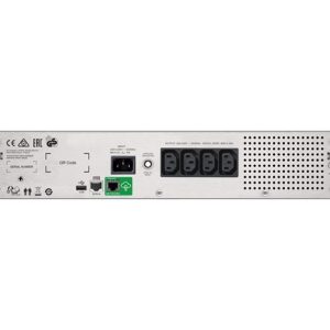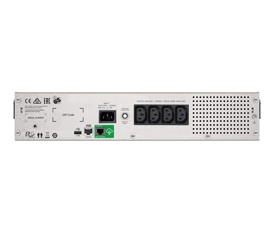 Počet výstupních zásuvek:4; Použití:Desktop, Aktivní síťové prvky; Provedení:Rackmount; Zdánlivý výkon VA:1000; Výška v Racku:2U; Topologie:Line-Interactive; Fáze (Vstup/Výstup):1:1; Komunikace:USB, DB-9 – RS-232, SmartConnect; Typ výstupu:IEC 13