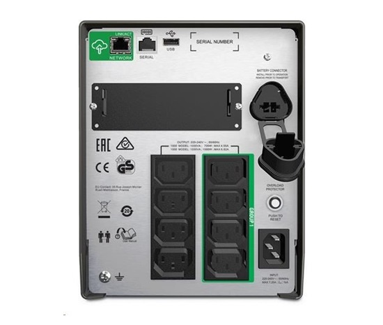 Počet výstupních zásuvek:8; Použití:Server; Provedení:Tower; Zdánlivý výkon VA:1500; Topologie:Line-Interactive; Fáze (Vstup/Výstup):1:1; Komunikace:USB, DB-9 – RS-232, SmartConnect; Možnosti:Volitelně Management karta; Typ výstupu:IEC 13