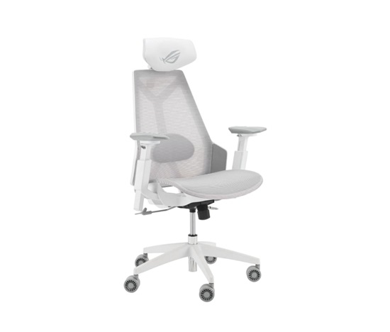Herní židle ROG Destrier Core ergo s futuristickou estetikou, všestranným nastavením sedadla pro dokonalé držení těla, mobilní herní opěrky rukou a vyrobená z odolného polyamidového nylonu a prodyšné síťoviny pro pohodlné herní maratony.