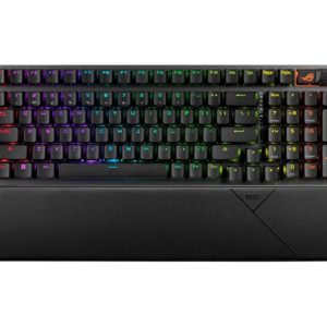 Herní klávesnice ROG Strix Scope II X s mechanickými spínači ROG NX V2 s možností výměny za provozu, pěnovým tlumením zvuku, zdvojenými klávesami PBT nebo ABS s UV povlakem, streamovacími klávesami, multifunkčními ovládacími prvky, třemi úhly sklonu a opěrkou zápěstí.