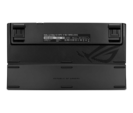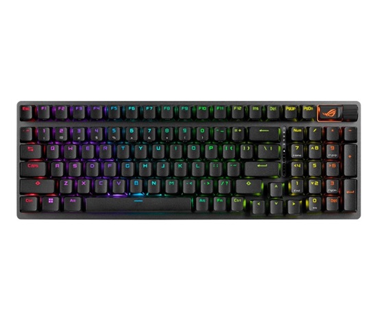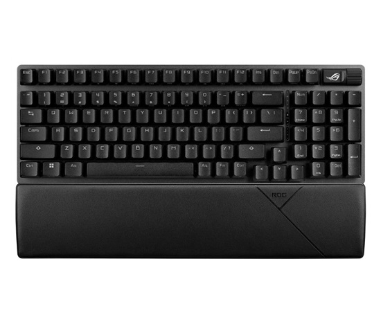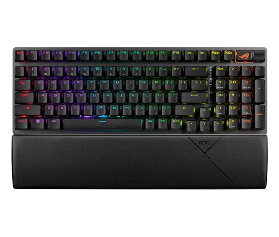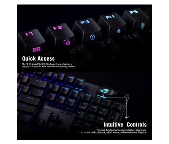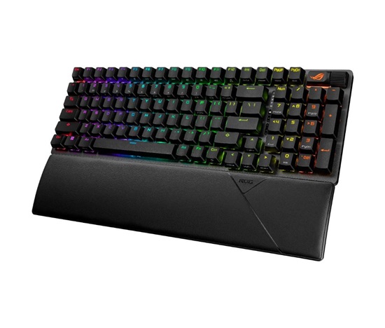 Herní klávesnice ROG Strix Scope II X s mechanickými spínači ROG NX V2 s možností výměny za provozu, pěnovým tlumením zvuku, zdvojenými klávesami PBT nebo ABS s UV povlakem, streamovacími klávesami, multifunkčními ovládacími prvky, třemi úhly sklonu a opěrkou zápěstí.