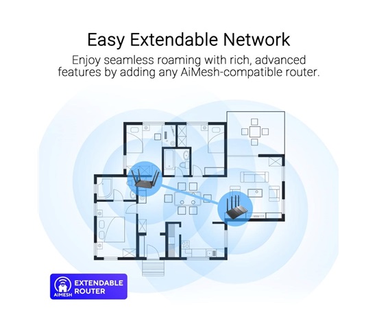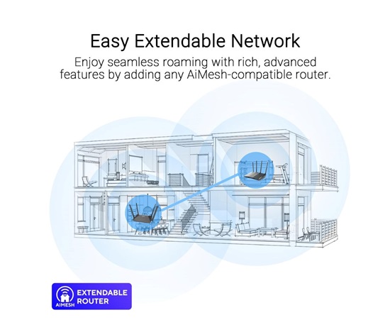 - Snadno rozšiřitelná síť – Vychutnejte si bezproblémový roaming s bohatými pokročilými funkcemi přidáním libovolného routeru kompatibilního s AiMesh.