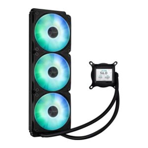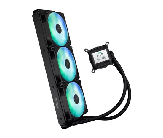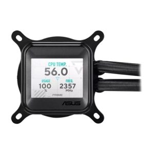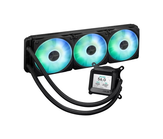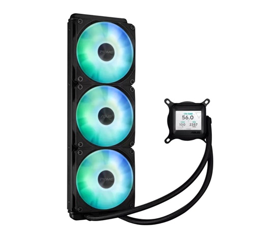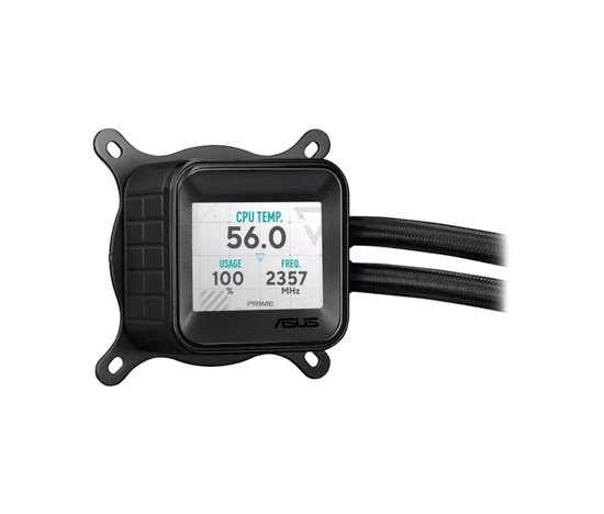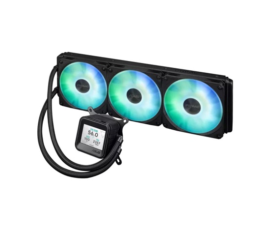 All-in-one vodní chladič procesoru ASUS Prime LC ARGB LCD s ostrým displejem zobrazujícím informace o procesoru a grafické kartě s různým pozadím, vysoce výkonným čerpadlem Asetek vybaveným robustním motorem a ventilátory s možností řetězení.