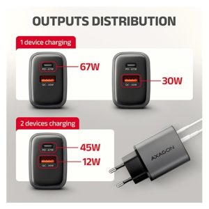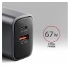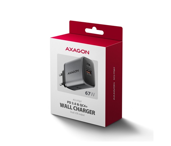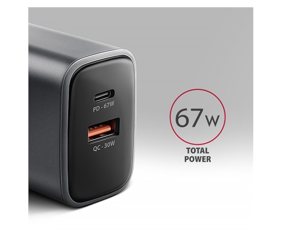 Cestovní nabíječka do sítě AXAGON ACU-PQ67 GaN umožňuje rychlé nabíjení až dvou mobilních zařízení současně. Díky celkovému výkonu 67W dokáže nabíječka dobíjet notebooky, tablety, telefony a další mobilní zařízení nejvyšší možnou rychlostí. Adaptér nabízí nejen standardní USB-A konektor, ale také oboustranný USB-C konektor.