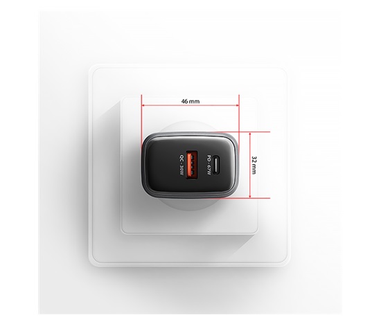 Tělo napájecího adaptéru má příjemný tvar a kompaktní velikost. Ve srovnání s klasickými nabíjecími adaptéry se stejnými parametry je velikost této nabíječky až o polovinu menší. Kombinace malých rozměrů, dosažených pomocí GaN technologie, a širokého rozsahu vstupního napětí, dělá z této nabíječky ideálního pomocníka na cesty.