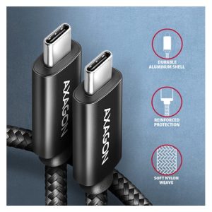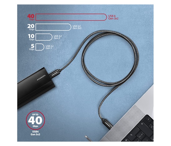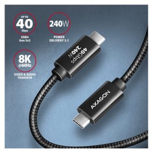 Prémiový propojovací USB-C <-> USB-C datový a nabíjecí AXAGON BUCM4X-CM10AB NewGEN+ kabel s konektory USB-C male na obou koncích. Kabel má plnohodnotné (Full-featured) zapojení podle specifikace USB 40Gbps (USB4 Gen 3×2) a je plně kompatibilní se specifikací Thunderbolt 3 a Thunderbolt 4. Je navržen pro nejrychlejší datové přenosy, přenos videa a nabíjení notebooků, telefonů, tabletů. Umožňuje připojení monitorů, dokovacích stanic a externích SSD disků.