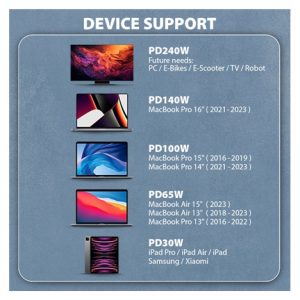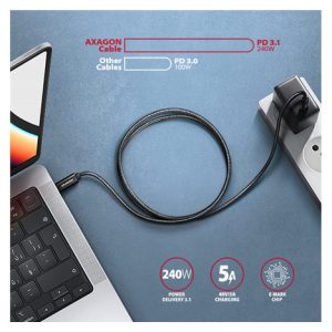 Kabel má implementovánu nejnovější specifikaci nabíjecí technologie Power Delivery 3.1. Tato technologie přináší mimo jiné výkon 240W což je více než dvojnásobek oproti Power delivery 3.0, která dosahuje výkonu 100W. Můžete tak využít nejen standardní rozsah výkonu (Standard Power Range – SPR) pro napětí 5, 9, 15 a 20V s proudem 5A, ale i dostatečný výkon v pevných napětí 28, 36 a 48V s maximálním proudem 5A (Extended Power Range – EPR). Kabel díky nové technologii PD 3.1 můžete využít i pro napájení zařízení s mnohem větším výkonem jako jsou herní notebooky, 8K monitory, dokovací stanice. Pro identifikaci kabelu a jeho proudových schopností má kabel integrován E-Mark čip.