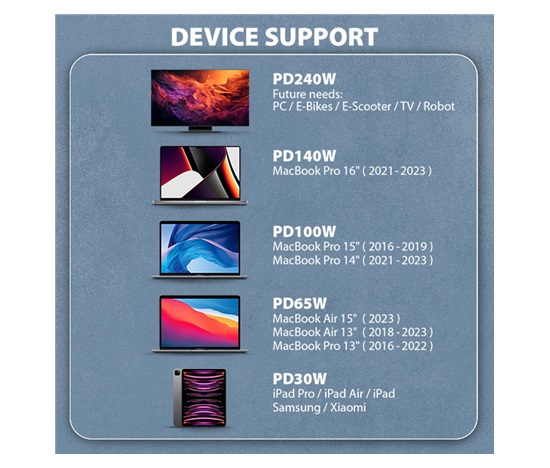 • Vhodný pro MacBooky, iPhone 15 Pro / Pro Max, notebooky, mobilní telefony a smartphony, tablety, powerbanky, nabíječky, monitory, dokovací stanice, externí SSD disky a další mobilní zařízení s USB-C konektorem.