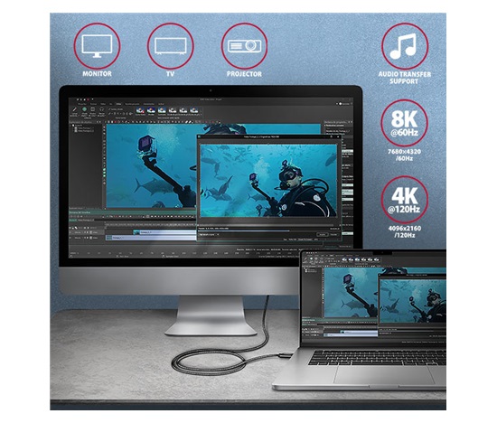 Kabel podporuje přenos dat rychlostí až 40 Gb/s, také umožňuje přenášet obraz až do rozlišení 8K/60Hz Full Ultra HD a zvuk.