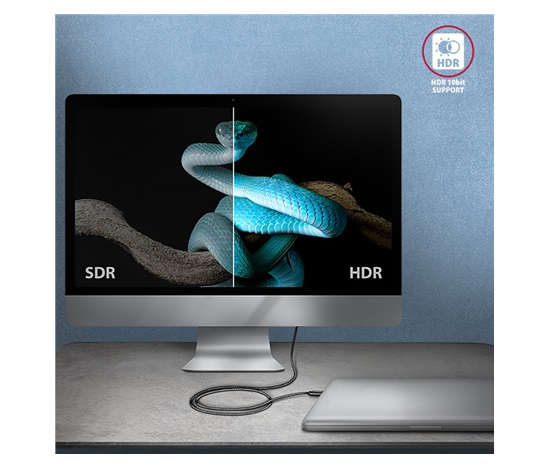 • Podpora protokolu DisplayPort 1.4a, 2.0 pro přenos zvuku a videa až do rozlišení Full Ultra HD 8K@60Hz, HDR10 – je nutný USB-C port s podporou DisplayPort Alternate Mode (DP Alt Mode) nebo Thunderbolt 3/4 port.