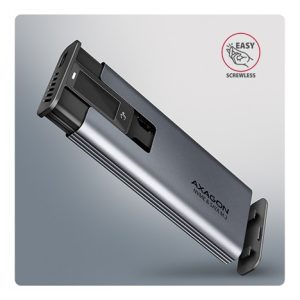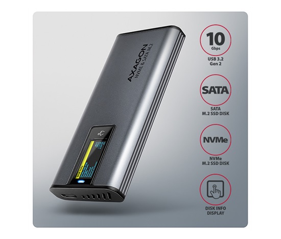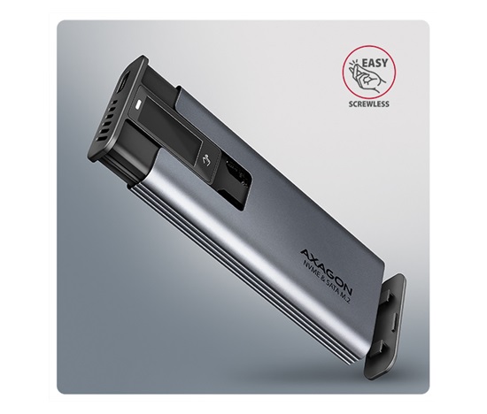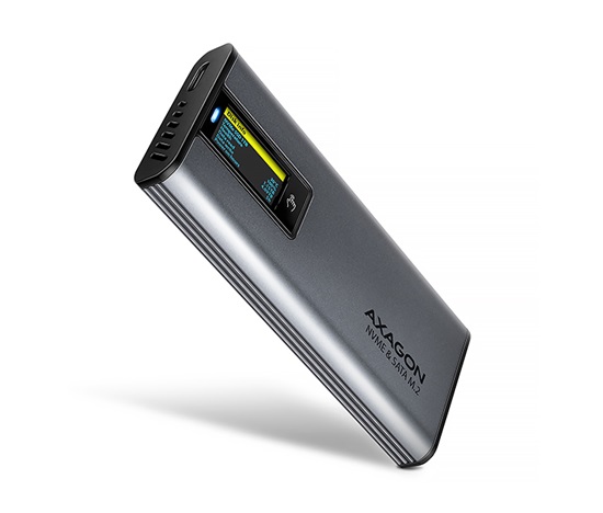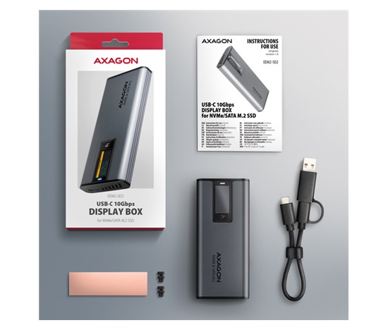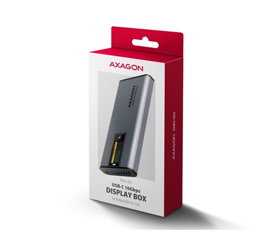 AXAGON EEM2-SD2 USB-C 10Gbps – M.2 NVMe & SATA SSD kovový DISPLAY box, bezšroubkový