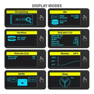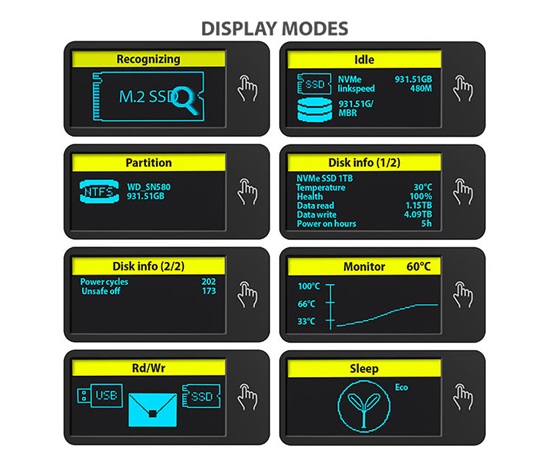 Box je vybaven pokročilým LED displejem, který poskytuje okamžitý přehled o stavu vašeho disku. Nabízí několik režimů zobrazení, včetně detekce připojeného disku, použitého systémového souboru, teploty, zdraví disku, rychlosti přenosu dat a pracovních hodin. Detailní graf umožňuje sledování teploty disku v reálném čase, zatímco režim spánku šetří energii při nečinnosti. S tímto inteligentním monitoringem budete mít svůj disk vždy pod kontrolou – jednoduše, přehledně a efektivně.