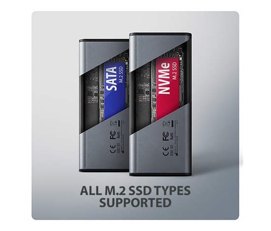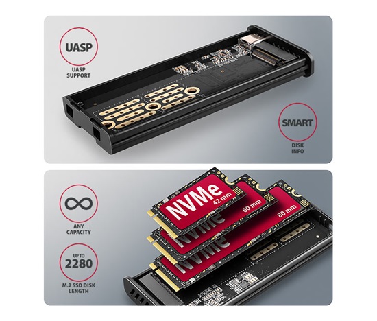Díky USB 3.2 Gen 2 rozhraní je přenosová rychlost až 10 Gb/s. Externí M.2 box podporuje i další moderní funkce např. UASP, TRIM a umožňuje čtení S.M.A.R.T. informací monitorujících stav disku. Unikátní vlastností, díky použitému čipsetu, je možnost použití jak M.2 NVMe tak i SATA disků. Nemusíte tak přemýšlet jaký typ M.2 disku do boxu vložíte. Box má možnost uchycení SSD karet ve třech různých délkách – 42, 60 a 80 mm. M.2 karty mohou být jednostranné i oboustranné, přičemž box neomezuje kapacitu vloženého SSD disku.