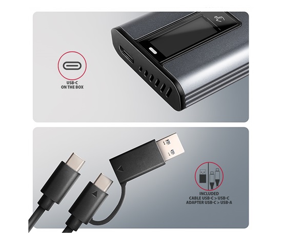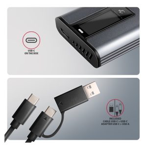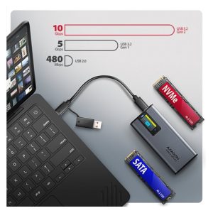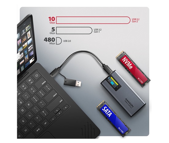 Externí AXAGON EEM2-SD2 DISPLAY box s USB 10Gbps rozhraním je určený pro M.2 NVMe nebo SATA SSD disky. Spolehlivé připojení k počítači umožňuje oboustranný USB-C konektor na boxu. V balení naleznete nejen kabel USB-C -> USB-C pro připojení boxu k počítači, ale také USB-C -> USB-A redukci. Můžete tak box připojit k jakémukoliv volnému USB portu na notebooku.