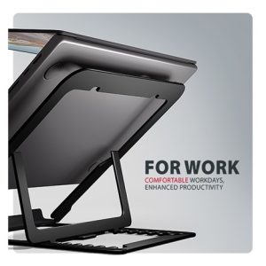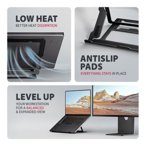 Stojan lze snadno složit do kompaktních rozměrů, což umožňuje pohodlné přenášení kamkoli potřebujete. Jeho elegantní design v černé barvě nejen stylově doplní váš pracovní stůl, ale také přináší praktické funkce, které oceníte při každodenním používání.
