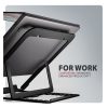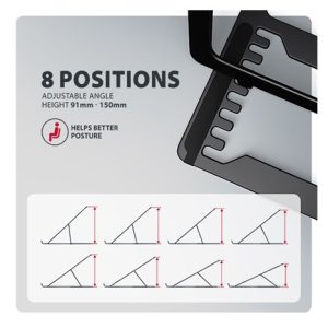 Velkou výhodou je možnost nastavení až osmi poloh. Díky tomu můžete notebook zvednout do výšky od 91 do 150 mm. Tím získáte další pracovní plochu ve správné úrovni očí, což výrazně zlepšuje ergonomii a pohodlí při práci, a zároveň zvyšuje vaši produktivitu.