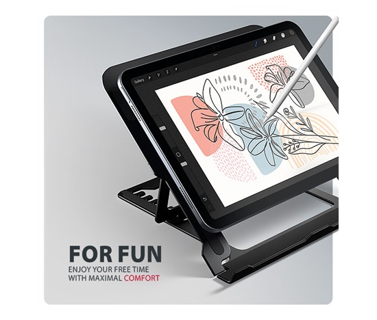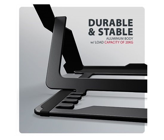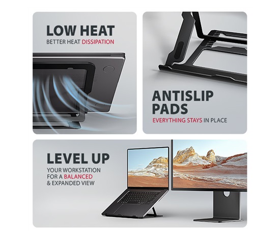 Podstavec je vyroben z hliníkových odlitků garantujících dlouhou životnost a spolehlivost. Díky protiskluzové úpravě se nemusíte obávat nežádoucích pohybů – vaše zařízení zůstane pevně na svém místě, a to bez poškození povrchu notebooku či podložky. Tyto pečlivě navržené vlastnosti zaručují perfektní stabilitu pro váš notebook, tablet nebo dokonce oblíbenou knihu, což vám poskytne klid a pohodlí při každodenním používání.