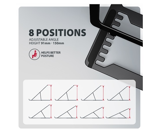 Velkou výhodou je možnost nastavení až osmi poloh. Díky tomu můžete notebook zvednout do výšky od 91 do 150 mm. Tím získáte další pracovní plochu ve správné úrovni očí, což výrazně zlepšuje ergonomii a pohodlí při práci, a zároveň zvyšuje vaši produktivitu.