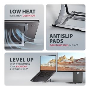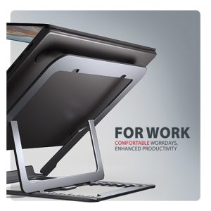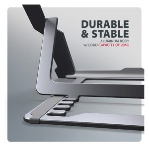 Podstavec je vyroben z hliníkových odlitků garantujících dlouhou životnost a spolehlivost. Díky protiskluzové úpravě se nemusíte obávat nežádoucích pohybů – vaše zařízení zůstane pevně na svém místě, a to bez poškození povrchu notebooku či podložky. Tyto pečlivě navržené vlastnosti zaručují perfektní stabilitu pro váš notebook, tablet nebo dokonce oblíbenou knihu, což vám poskytne klid a pohodlí při každodenním používání.