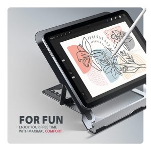 Stojan lze snadno složit do kompaktních rozměrů, což umožňuje pohodlné přenášení kamkoli potřebujete. Jeho elegantní design v šedé barvě nejen stylově doplní váš pracovní stůl, ale také přináší praktické funkce, které oceníte při každodenním používání.