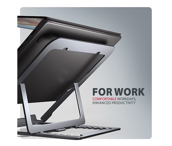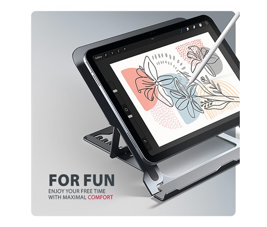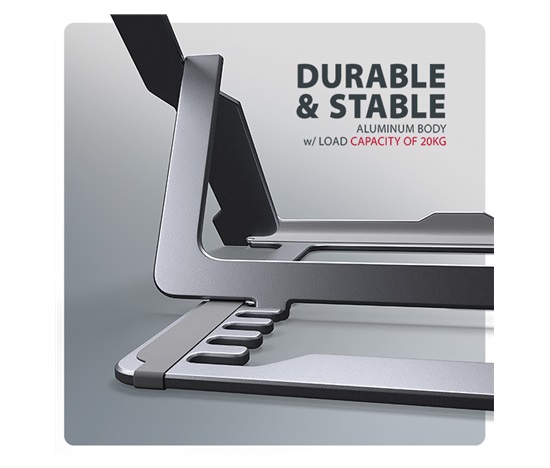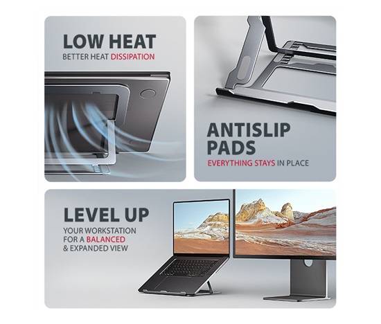 Podstavec je vyroben z hliníkových odlitků garantujících dlouhou životnost a spolehlivost. Díky protiskluzové úpravě se nemusíte obávat nežádoucích pohybů – vaše zařízení zůstane pevně na svém místě, a to bez poškození povrchu notebooku či podložky. Tyto pečlivě navržené vlastnosti zaručují perfektní stabilitu pro váš notebook, tablet nebo dokonce oblíbenou knihu, což vám poskytne klid a pohodlí při každodenním používání.