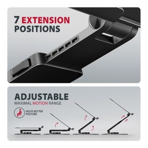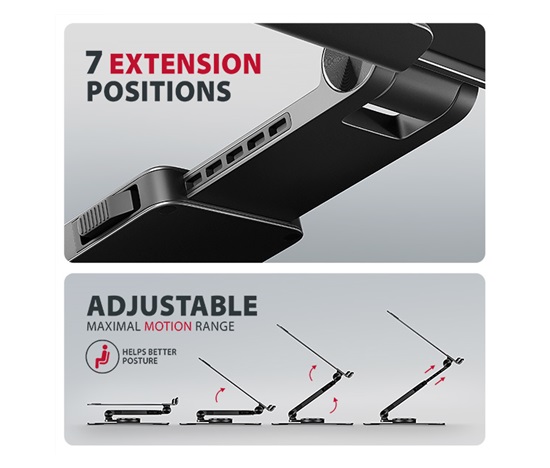 Unikátní funkcí je výsuvné rameno s pojistkou proti uvolnění, které umožňuje jeho prodloužení až o 6 cm díky sedmi nastavitelným pozicím. Tímto způsobem snadno nastavíte notebook do optimální výšky a vzdálenosti od vašich očí přesně podle vašich potřeb. Chytré řešení s dvojitým kloubem poskytuje plynulé nastavení výšky obrazovky tak, aby byla v jedné rovině s vaším externím monitorem. Tím získáte další pracovní plochu ve správné úrovni očí, což výrazně zlepšuje ergonomii, zvyšuje pohodlí a zároveň podporuje vaši produktivitu.