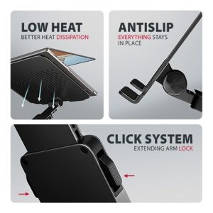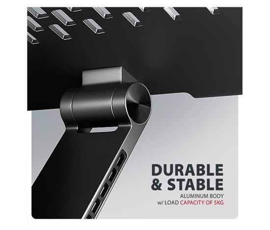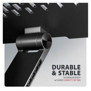 Podstavec pro notebook je vyroben z robustních hliníkových odlitků garantujících dlouhou životnost a spolehlivost. Díky protiskluzové úpravě zůstane vaše zařízení bezpečně na svém místě bez rizika nechtěných pohybů, aniž by došlo k jakémukoliv poškození povrchu notebooku nebo podložky. Tyto pečlivě navržené vlastnosti zaručují perfektní stabilitu pro váš notebook, tablet nebo oblíbenou knihu, což vám poskytne klid a pohodlí při každodenním používání.