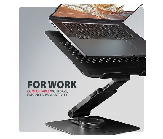 360° mechanismus umožňuje otočení celého ramene s notebookem okolo své osy. Tato funkce zajišťuje maximální flexibilitu – snadno změníte orientaci notebooku, aniž byste museli stojan přemisťovat. To oceníte zejména při práci v omezených prostorech, nebo při sdílení obrazovky notebooku při obchodních jednáních, poradách nebo prezentacích.