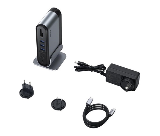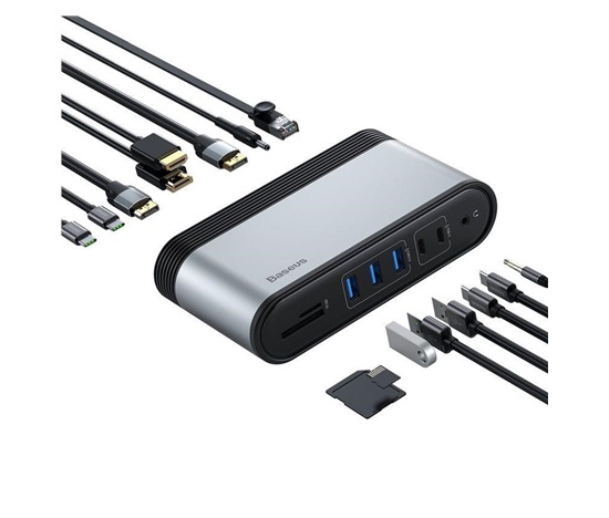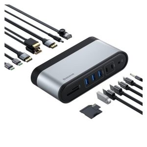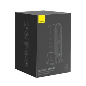 Pracovní stanice Baseus řeší problémy spojené s nedostatečným počtem portů, protože jich má hned 16. Vstup pro karty SD/TF podporuje disky s maximální kapacitou 2T. Porty USB umožňují rychlý přenos filmů nebo fotografií a připojení například flash disku. Má také audio port pro připojení reproduktorů nebo sluchátek a porty HDMI a DP pro připojení několika obrazovek najednou. Port RJ45 poskytuje rychlé a stabilní připojení k internetu a port PD podporuje 100W rychlé nabíjení.