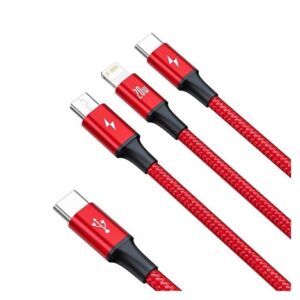 Kvalitní opletený multifunkční datový a nabíjecí kabel s konektorem USB-C, zakončený hned trojicí konektorů (Lightning nabíjecí/datový port, USB-C nabíjecí port a microUSB – nabíjecí port) v červeném provedení. Kabel podporuje přenosovou rychlost až 480Mbps. Délka kabelu (lze sepnout páskem na suchý zip) je dostatečná pro pohodlné používání a nylonové opletení zaručí dlouhou životnost. Díky své univerzalitě je možné najednou propojit širokou škálu mobilních zařízení.