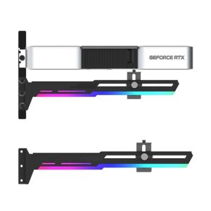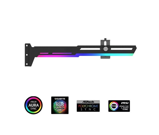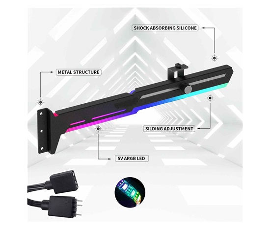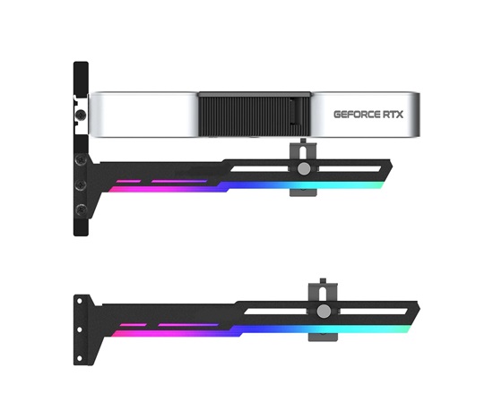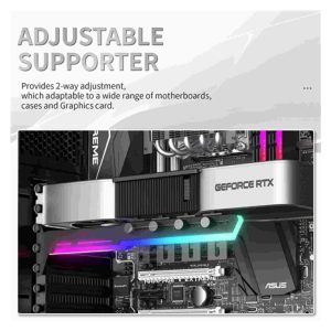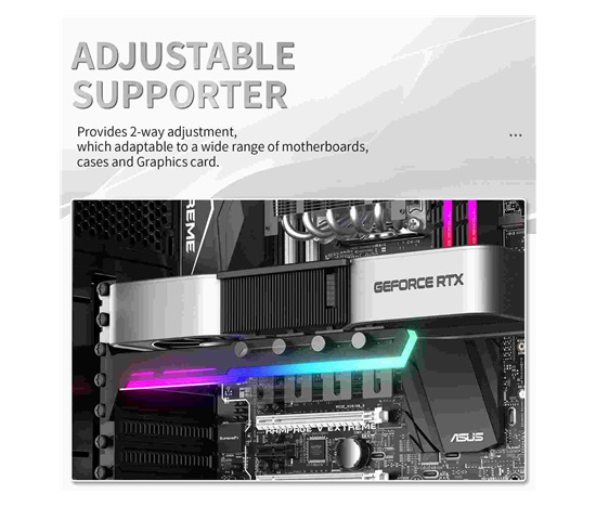 Stylová varianta této opory Vaší grafické karty je vyrobena z ocelového práškově lakovaného plechu a plastu, zabraňuje prohýbání větších karet ve slotu a dodává tak sestavě lepší celkovou stabilitu. Součástí je silikonová posuvná opora, kterou lze posunout jak horizontálně tak i vertikálně a umožňuje instalaci v různých místech karty, pro maximální kompatibilitu s většinou karet. Rozměry držáku jsou 280 x 52mm.