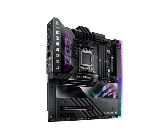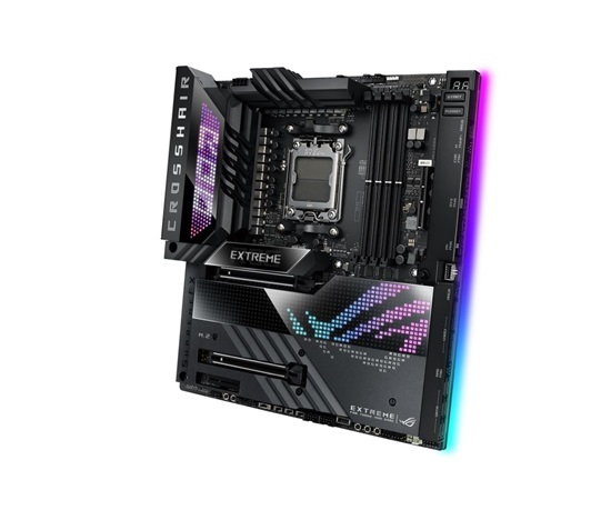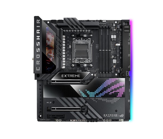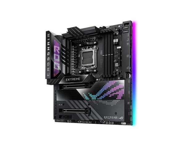 AMD X670 EATX motherboard with 20 + 2 power stages, DDR5 support, five M.2 slots, ROG Gen-Z.2, USB 3.2 Gen 2×2 front-panel connector with Quick Charge 4+ support, dual USB4, PCIe 5.0, onboard Wi-Fi 6E and Aura Sync RGB lighting