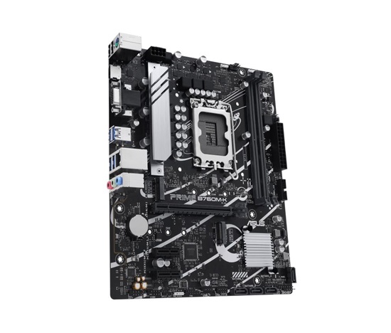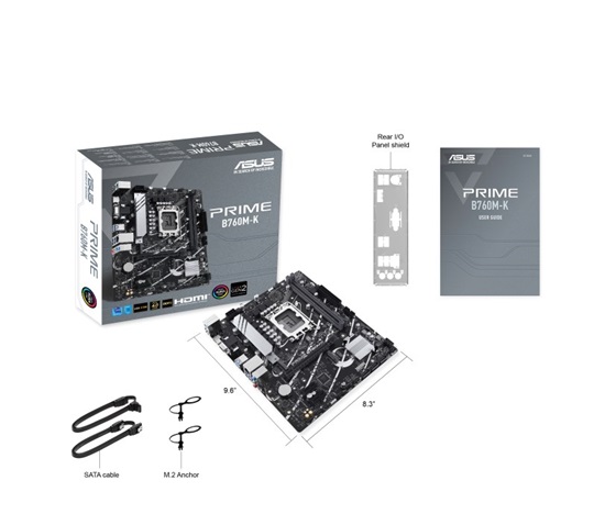 ASUS Prime B760M-K, an Intel B760 LGA 1700 mATX motherboard with PCIe 4.0, two PCIe 4.0 M.2 slots, DDR5, Realtek 2.5Gb Ethernet, VGA, HDMI™, SATA 6 Gbps, front USB 3.2 Gen 1, Aura Sync