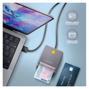 Kompaktní stolní čtečka Smart card / ID card AXAGON CRE-SM3T FlatReader s USB 2.0 rozhraním. Je vhodná zejména jako čtečka občanských průkazů pro použití s počítači, které disponují USB vstupem. Nejrozšířenější USB-A konektor zajistí připojení jak k novému, tak i staršímu počítači.