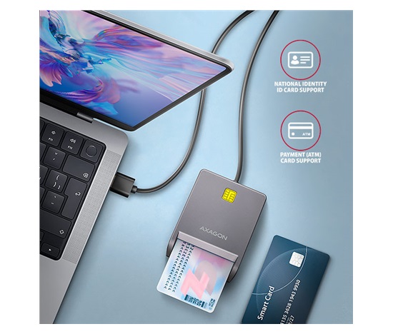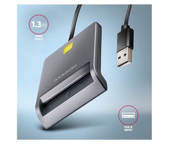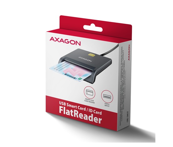 Kompaktní stolní čtečka Smart card / ID card AXAGON CRE-SM3T FlatReader s USB 2.0 rozhraním. Je vhodná zejména jako čtečka občanských průkazů pro použití s počítači, které disponují USB vstupem. Nejrozšířenější USB-A konektor zajistí připojení jak k novému, tak i staršímu počítači.