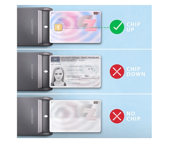 * Pozn.: Čtečka podporuje pouze kontaktní karty, které mají na povrchu viditelné kontakty. Karty bez kontaktů, známé jako RFID, nelze ve čtečce použít.