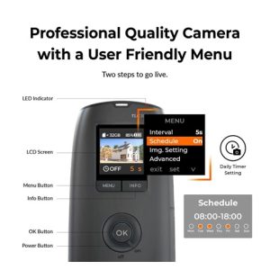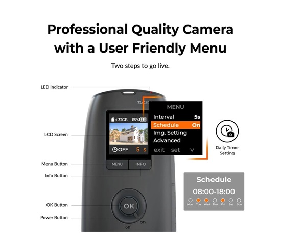 Kamera BCC300 je vybavena revolučním jednostránkovým designem pro nastavení parametrů časosběrného snímání, který integruje plán, interval snímání a nastavení obrazu do přehledného menu, což z ní činí uživatelsky nejpřívětivější profesionální časosběrnou kameru.