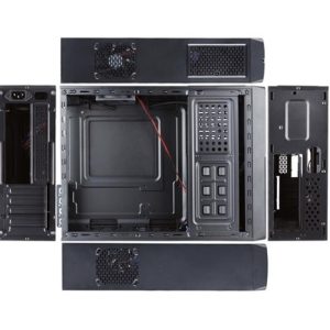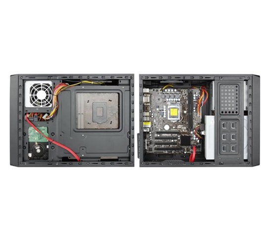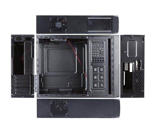 Integrovaný zdroj; Provedení skříně:Mini Tower / micro ATX; Barva skříně:Černá; Počet pozic 5.25″:1; Počet pozic 3.5″ (HDD):3; Počet pozic 2.5″ (SSD):2